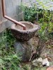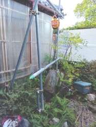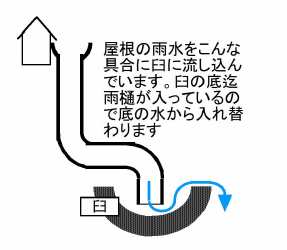 雨樋をで屋根の雨水を流し込む。おまじないだが、臼の中には、銅イオンの殺菌効果を期待し裸の銅線が入っている。