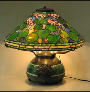 [コメント] 以前から気になっていたゼラニウムのティファニーランプを作りました。暖かい雰囲気に仕上がって、また台ととてもマッチして大変気に入っています。(14,.DEC.2005)