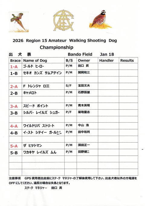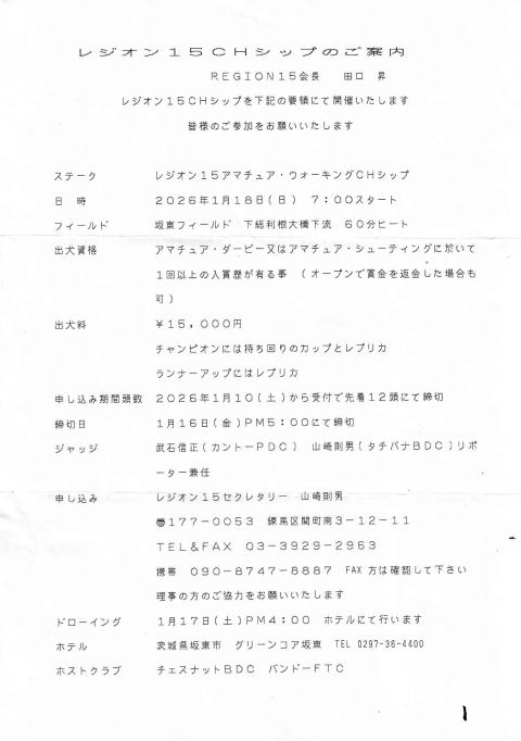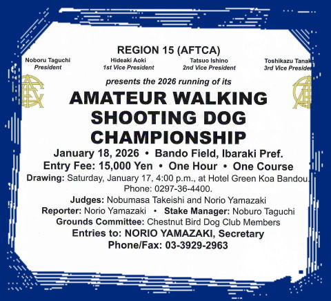 | 1 AMATEUR WALKING SHOOTING DOG CHAMPIONSHIP スタ−ト 2013年2月 9日 (土) 10日 (日) AM 7:00 60 ヒ−ト フイ-ルド 浜北フイ−ルド ドロ−イング 2013年2月9日 (土) PM 5:00 シャジ−ズ 武石信正. 中川 弘. 佐々木好夫 ステ−クマネジャ− 古茶治男 Region 15 会長 ホストクラブ セントラル ジャパン FTC エントリ− フイ− \ 15.000 賞 典 Region 15 トロフイ− 賞 品 申し込先 322-0345 栃木県鹿沼市旭ケ丘135-165 Secretary 菊地孝三 Tel &Fax 0289-77-2986 宿泊ホテル ビジネス ホテル 高歯 フリ−ダイアル 0120-880-887 宿泊希望される方 菊地まで連絡下さい。 7組の場合は 10日 日 だけに成ります。 ドロ−イングは 9日と成ります。 8組以上の場合は 2日間とします。 出走の日程指定は出来ません。 申し込の時 AFTCAの賞歴 ナンバ−を記入してください。 Region 15 会長 古茶治男 |