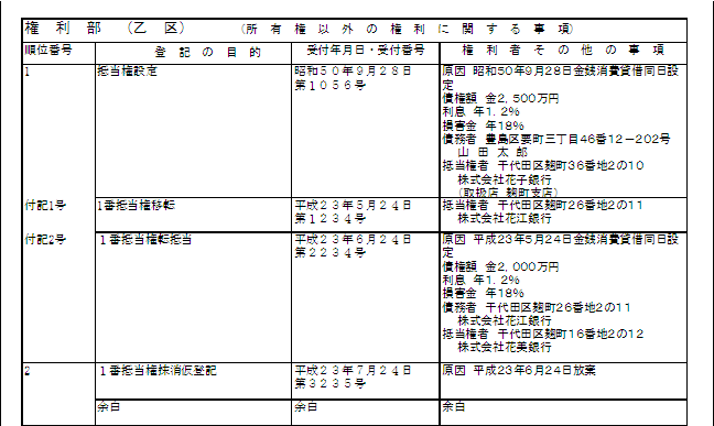 | です。正解! 理由も大切ですね。 では、利害関係人として考えられる人を増やしましょう。登記記録は以下の通り。1番抵当権に、転抵当権者がいます。乙区1番付記1号、2号、2番の受付日をチェックして、登記がされた順番を確認してくださいね。 |