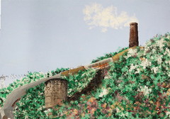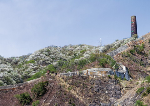 鉱山の製錬所の溶解炉で銅鉱石を溶かすとハ(かわ)(銅)と゚(からみ)(銅以外のもの)に分離されます。製錬所跡の斜面にこのカラミが広がり、黒く観える光景は日立市ならでは。