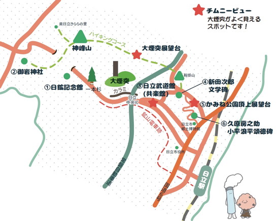日立鉱山の福利厚生施設として1917(大正6)年に完成した劇場。歌舞伎のほか講演会、演奏会、映画上映などを開催。現在は日立武道館として使用。ここからは大煙突をみることができます。 |  |