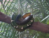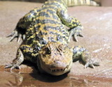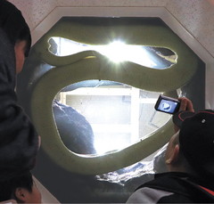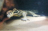 クチヒロカイマンの水槽の近くには、天井にぽっかり穴が。2階のヘビ飼育スペ ースの真下で、普段は見えない姿が観察できます。「爬虫類のこういう姿が見 たい!」という、まずは飼育員が楽しむ発想から、この工夫が生まれました。 |