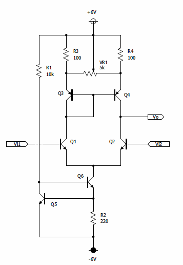 前回までの周辺回路を組み込んだ差動増幅回路が図1です。また、 今回から製作する回路と同様に±6[V]の両電源で回路を構成します。 おや?カレントミラー回路に変な抵抗 R3、R4、VR1 がついてますね? これが、素子の特性差を補正するための補正回路です。 カレントミラーに抵抗がつくとどういった動作になるのでしょうか?