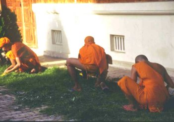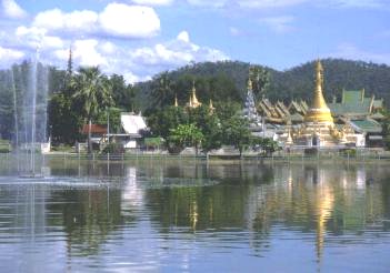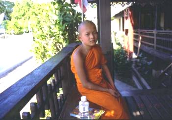(メーホーソン観光) それでは市内観光でもしようと、池のほと りに建つ寺院(ワット・チョーン・カムと ワット・チョーン・クラーン)に行く。さ すがに、ここまで来ると、お寺さんもミャ ンマーに近い感じがする。しばらく写真を 撮ったりして眺めながら昼寝をする。写真 を見てもらえば雰囲気はわかるでしょう。 ついでに、寺院の中にも入ってみる。小坊 さんがいた。話し掛けてみるとなかなかカ ワイイ「まるこめミソ」だ。一緒に写真を 撮りながらしばらく遊んだ。 |