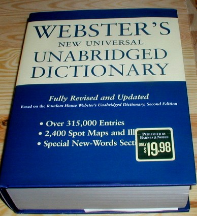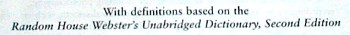 で、Burnes & Nobleで、特価本の中にまじってこれを見つけた時にはすぐ買った。なんと$19.98(定価$49.95)。2230ページの辞書でこの値段はと思ってしまう。なかなかおもしろい辞書で、the second edition of The Random House Dictionary of the English Language, the Unabiridged Edition をベースに、2003年に、Barnes & Noble(大型店舗売りを大事にする多分アメリカ最大の本屋のチェーン店)が、Revised and Updatedしたと、Acknowledgments and Permissionにある。ところが、表紙とか中表紙(写真)には、the Random House Webster's Unabridged Dictionary, Second Editionがベースとある。まあ、同じ事なんだけど、厳密さが要求される辞書に、これはないだろうと思うのは日本人の性?