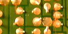 近眼の眼鏡をはずしマクロモードにした、40過ぎて見えなくなった目で基板をなめながら、手であちこち押しながら、場所の特定に入る。15分ほどで、見つかったのは、足下が @(2重円)になった、半田パッドが、4カ所。添付の写真で、右の方に、3個縦に並んでいて、赤で着色してあるのがそれ(少し解りづらいかも知れないが)