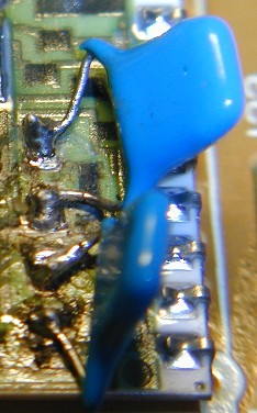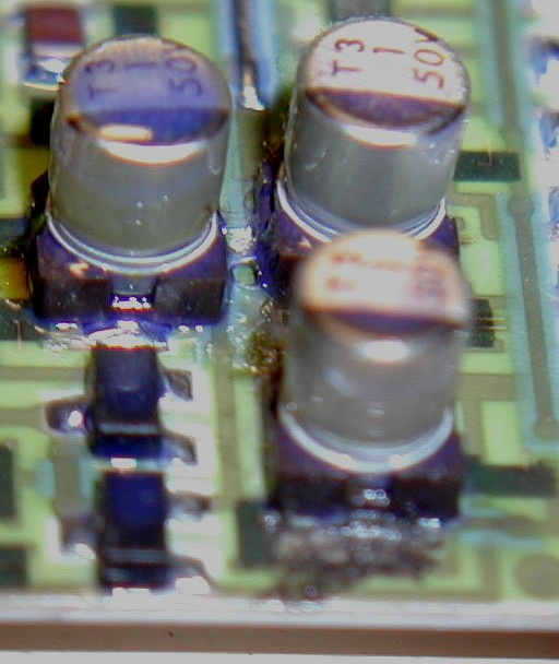 抵抗値がさがる。確かにサーミスタで正常らしい。すると、コントロール基盤が問題となる。大型であるので、基盤は熱から遮断されており、そりもないし、電解コンも変なのはない、裏返しても半田も正常。で、サーミスタがつながっているパターンを追っていくと、HICに入っている大した部品ものっておらずなんでHICにする必要があるのという感じ。このあと、マイコンに入っているので、要は、サーミスタの非線型補正をして電圧出力をするHICらしい。で、このHICをみると、表面実装電解コンの根元がおかしいのが2箇所ある。テスター棒でさわるとグジュグジュ。電解コンのおもらしらしい。1uF50V。最初の写真がこれ(左奥が正常、右手前が異常、ピントが患部に合っていないのでわかりにくいが)。パシベーションのためにエポキシを塗ってあるので、この2つの電解コンを根元から切って、端子から熱を加え、除去。で、メタライズフィルムの1uF50Vをつけた。2つ目の写真がこれ。