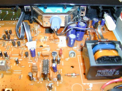 トランスの右の方にあるICが、MPX用で、その最終出力の電解コンは、音質に影響を与えるし、DCの漏れがでると、アンプ系が自作DCアンプなもんで、事故のもとなんで、日本から持ってきた、高級オーディオ用に交換。