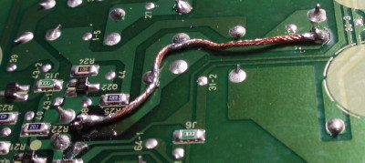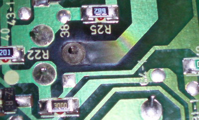 焦げて黒くなっているFETらしき石の足が、やはり、銅箔も浮いて真っ黒。2つ目の写真の右端の所。