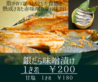 風味豊かな特製赤味噌に漬け込んだ銀だらで、熟成された味噌の香りと魚の旨みが絶妙な調和を演出します。表面は香ばしく中身はしっとりした仕上がりで一口ごとに深い味わいが楽しめます。 |