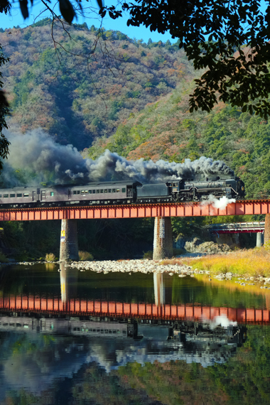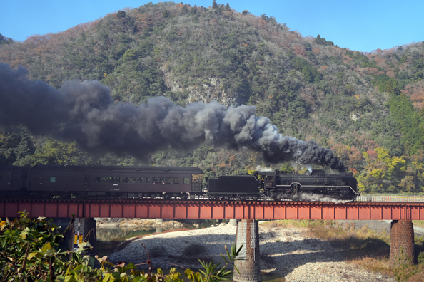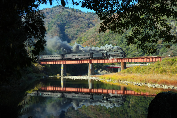 長門峡を出て水鏡の美しい阿武川を渡る D51200 (長門峡−渡川;第一阿武川橋梁)