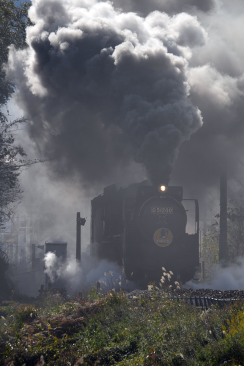 爆煙?煙幕?の徳佐駅発車 D51200 (徳佐−船平山;徳佐駅発車)