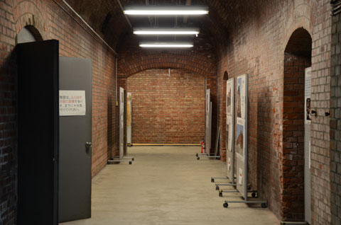 旧ボイラー室を出て旧原料処理室の中を通る。左へ曲がり廊下へ入る。内部の壁も煉瓦造である。