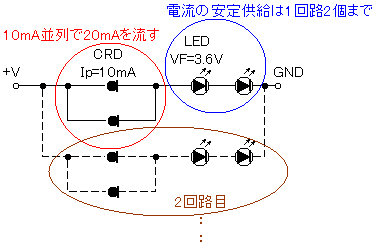 LEDに必要とする電流20mAを供給するため、10mAのCRD(定電流ダイオード)を並列に接続。
