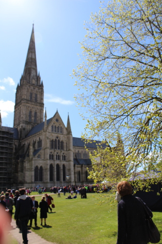比較するものが無いので、大きさはわかりづらいかと思いますが・・・本当に、大きかった。 でも、思ったより感動しなかったなぁ(笑) (右下)この岩だけが、ポツンとサークルから外れて置かれています。 しかも、表面を削られていない状態らしいです。 ちょっと、顔みたいで怖いかも・・・・・・。 ![]() 東側を歩いてた時に、すぐ近くに羊の群れがいました♪ 嫁は、Stonehengeそっちのけで、羊に夢中♪ かわいいよぅ♪ ![]() 12:30 ぐるりと見終わり終了! (ちゃんと、ガイドを聞いていれば、もっとかかります。) 13:00 Stonehengeの玄関口といわれる街、Salisbury(ソールズベリー)に到着! しかし、すごく人が多くて、駐車場も満車で見つからない! (なぜか、この街ではカーナビの音声機能が無効化されていたのです???) 警察官も大勢いるし・・・、大通りにはパレードでもあるのか、ユニオンジャックの飾りつけが・・・? 何か、イベントでもあるの??? 車で30分ほど街中をさまようと・・・・・・やっと、街の反対側の外れに大きな駐車場を発見! しかし、駐車料金が、2時間 £2.50 手持ちの小銭は£2.30くらい。 券売機は、お札の投入口も無いし、それどころかお釣りの返却口も無かったのです! 券売機の前で困っていると、老紳士が切符を買いに来たので順番をゆずることに・・・。 老紳士は、私たちが販売機の使い方をわからないと思ったのか、声をかけてくれました。 小銭を見せて・・・「小銭が足りないの」と、ジェスチャーで伝え、 管理室っぽい建物を指さして「small changes?」と聞くと、「No. Shop」との答えが、 う〜ん。どこかのお店までいかないと小銭は手に入らないのね。 すると、老紳士の奥さんが来て、二人で少し話した後、50pを出してくれたのです。 なんて、親切な人なんだ!! やっぱり、イギリスは紳士淑女の国でした。 再び、街に戻ると、道路は通行止めになっていました。(危なかったぁ。) さっそく目的地の、Salisbury Cathedral(ソールズベリー大聖堂)に向かうことに、 「でも、地図もないし・・・さっき車で通り過ぎたけど・・・どこだったっけ?」 警察官に聞いてみると、「何か書くものある?」とジェスチャーされたので、 トラベル英会話の表紙の裏側に地図を描いてもらいました。 本当に、鼻歌を歌いながら地図を描くんですね。 映画だけじゃないんだ(笑) Salisbury Cathedralに到着!・・・やっぱり、ここがメイン会場なのね。 大聖堂の広場には、ものすごい人だかりが・・・・・・。 ![]()