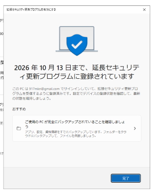 その対処を含めて次のPC(7代目)に乗り換えていった。 廃棄のPCについて、ショップ(Good Will岡崎店)で、CPU,DVD レコーダー,メモリーは買い取ってもらった。電源装置は購入後10ヶ月しかたっていないので、ケースと共に私の方で保管することにした。 ![]() H27年9月作成の7台目<上の写真のPC>は、インテルCore i3-4170 2.66GHz のCPUにM/B ASUS製H97-PLUS の組み合わせ、メモリはDDR3-1600 2GB×2、OSを Windows 7 HE版SP2、HD: serial ATA 500GB, SSD 240GB. 新しいSSDにパーティションを作りOSをインストール。前のHDDはデータ用として接続して活用する。 SSD C:122GB 、D:100GB HDD E: F: G: H:(バックアップ用として)178GB 必要なソフトと設定をしてから、Windowsバックアップでシステムイメージ等をHドライブに保存。 H28年4月 Windows7から Windows10へのアップグレード 今すぐアップグレードを実施して、アップデートできた。特に問題はなし。 カメラの写真の取り込みと印刷方法は変更した。一太郎2016のインストール。さらにLibre Office(フリーソフト)をインストール(Word,Excelの代わりに)。 また、Windowsバックアップも システムイメージ等をHドライブに保存。 ![]() ところが、”キーボードやマウスにちょっと触れただけで、PCが勝手に起動してしまう状態になってしまった”。 ショップの方に相談して対処。 デバイスマネジャーの中でPS/2キーボード、MicrosoftPS/2マウスの「プロパティ」の電源の管理でチェックを外すことで、スリープの状態を解消できた。(M/Bのマニュアルの指示で、設定しておいたが、さらに追加してこの設定が必要) 今は快適に動いている。 ![]() R4年11月 、無料ソフト「パーティションアシスト」で、SSDでC:122GB→182GB、D:100GB→40GBにパーティションを変えた(C:ドライブを増やす)。また、HDDでもE:にG:を結合して248GBに増やし、G:ドライブはなし。結果として、E:248GB(バックアップ用として)、F:39.6GB、H:178GB.。 ![]() R5年に入り、 上の画面(Windows11にアップできない)が表示されてきた。 CPU(第4世代)とマザーボードがWindows11には対応してないので、アップグレードできない。 Windows10はR7年10月14日迄サポートが受けらるので、まずは使い続けていきたい。 R7年7月 マイクロソフト社より、サポート1年延長の情報が入り、条件を満たせば無料でできる事が分かった。その為には、ワンドライブでWindowsバックアップの設定をオンにする。Windows V22H2へ。Windows Updateで最新の状態を保つ。 ということが必要。 ![]() R7年8月25日 条件を満たしていたので、Windows Updateに案内がきて、指示に従って操作し、サポート1年延長「ESU」の登録を完了することで、このままR8年(2026年)10月13日迄サポートが続き、安心して使い続けることができるようになりました。 ![]()