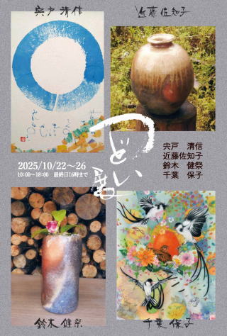 宍戸清信(書) 近藤佐知子(陶器) 鈴木健祭(陶器) 千葉保子(コラージュ)
