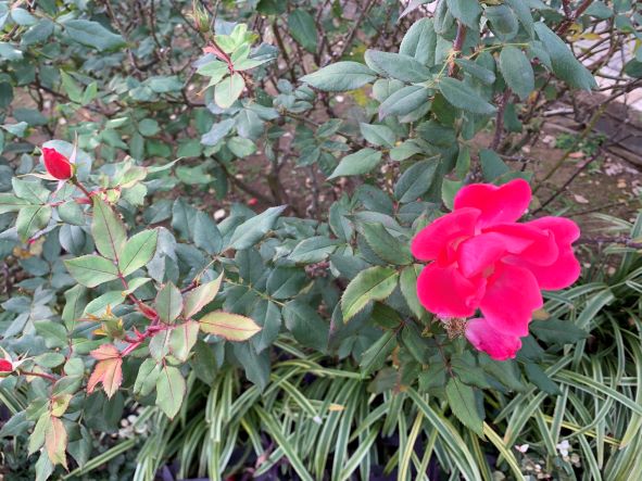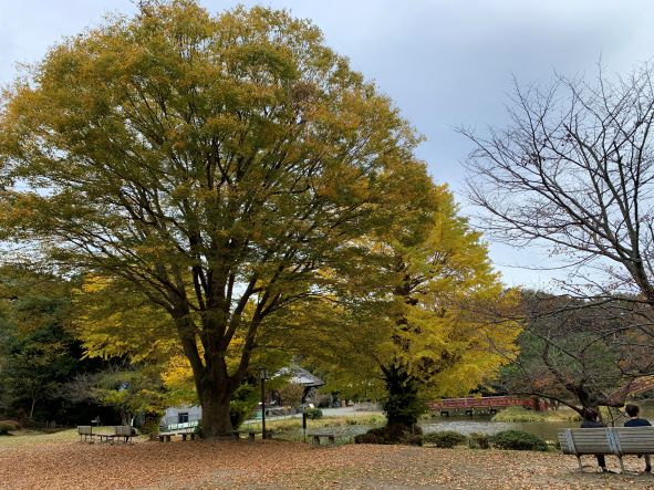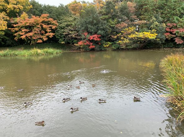 紅葉とカモ ケヤキとイチョウ ノボタン ツワブキ ボタン