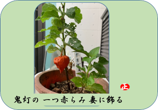 『鬼灯の 一つ赤らみ 妻に飾る』