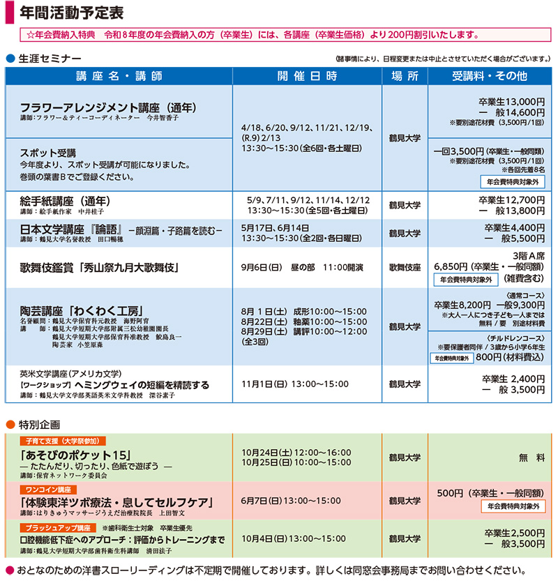 | 申 込 者 | [卒業生] | ①会員番号(封筒宛名右下の数字)➁名前➂連絡先(日中連絡がとれる電話番号) ➃希望講座⑤申込人数(ご本人 名、一般 名、子ども 名) ▶▶▶ 申込用紙ダウンロード |