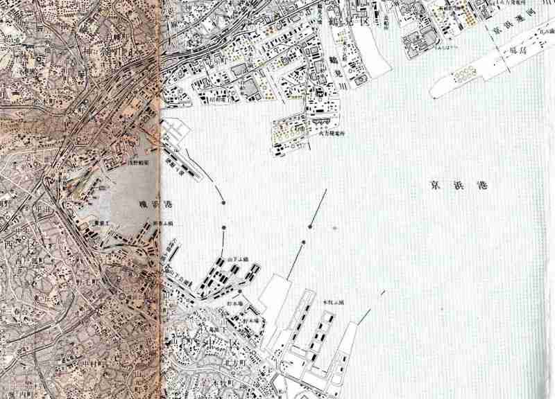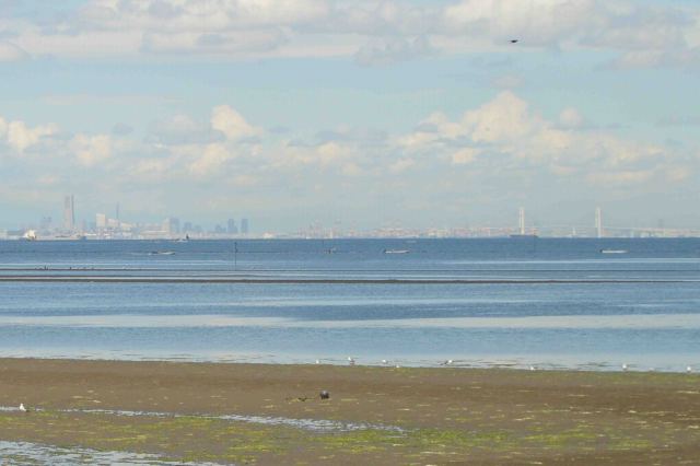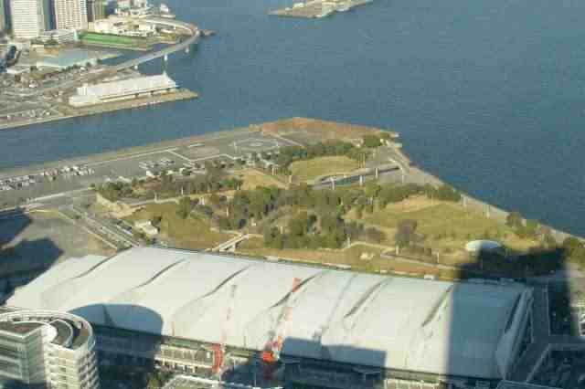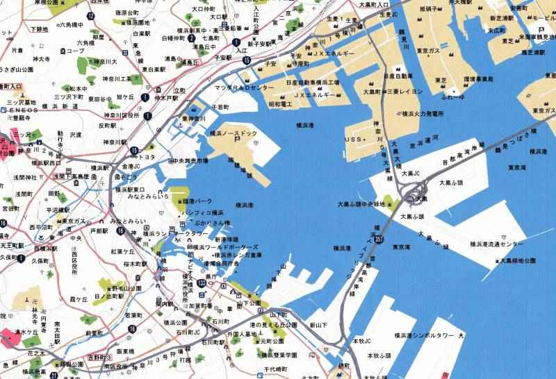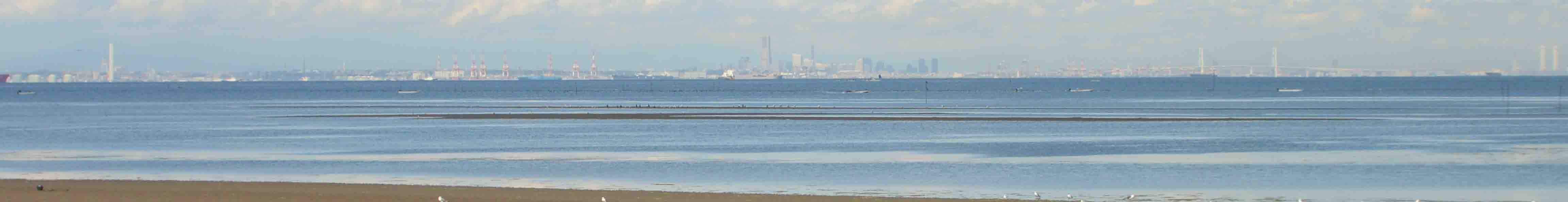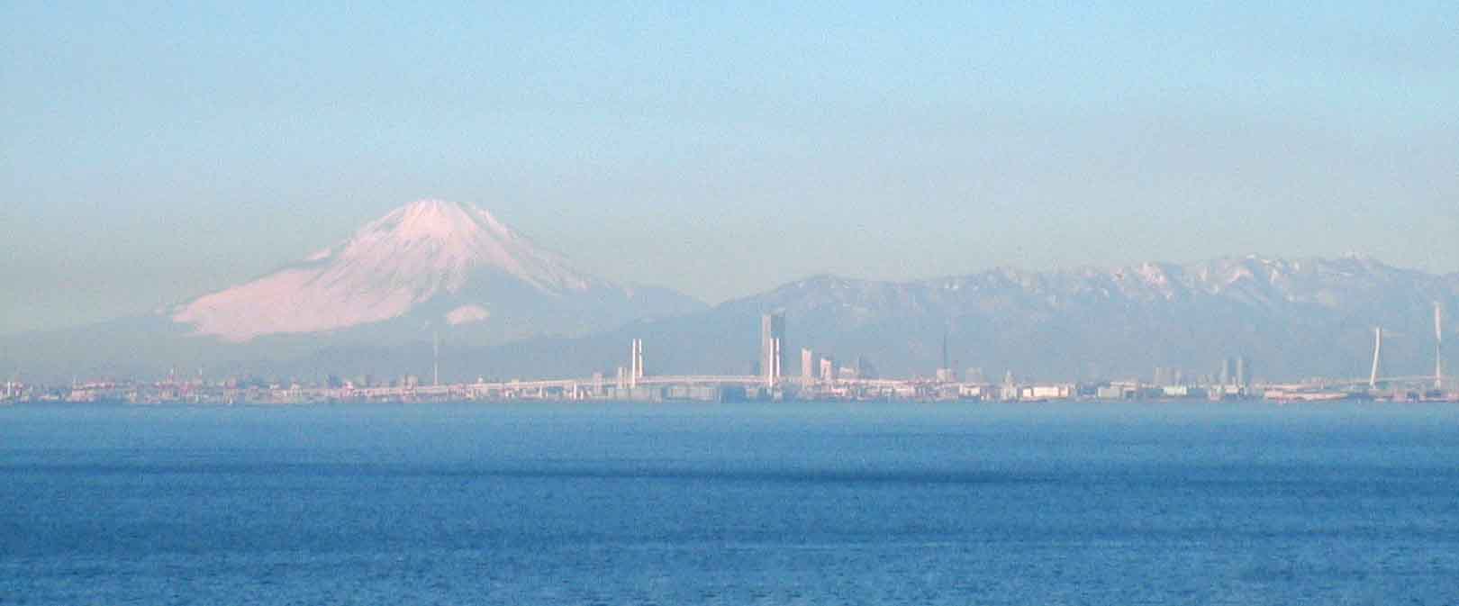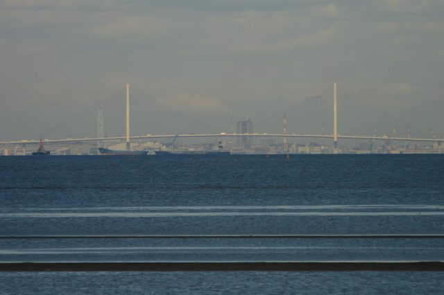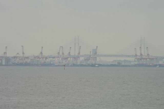 ![]() 左から金沢区福浦地区。中央にみなとみらい地区。右端の白いのが扇島火力発電所。その中間にある二本の白い部分がベイブリッジ。