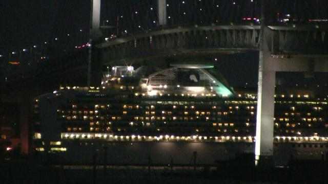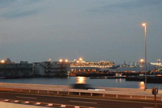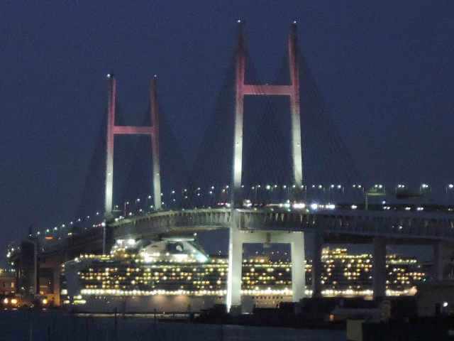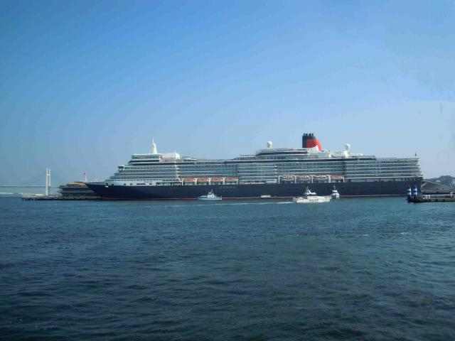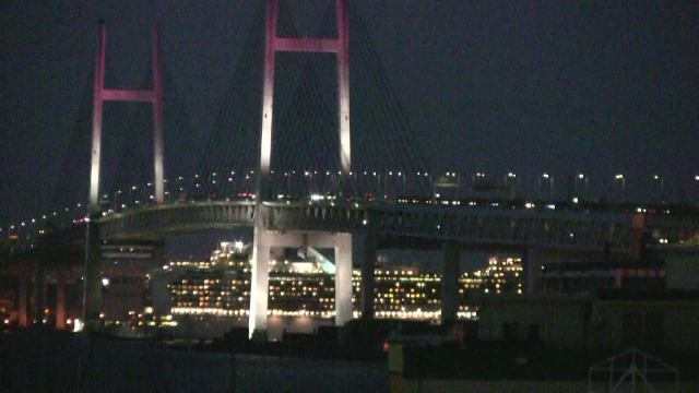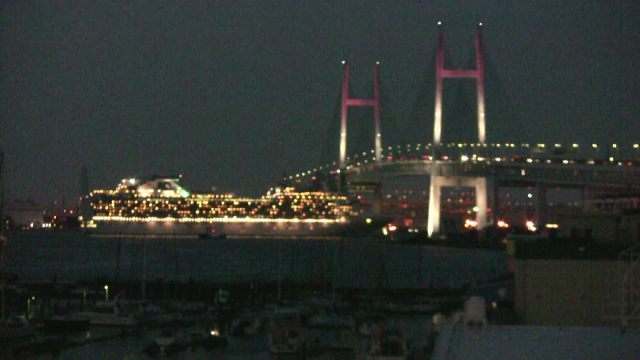 10.ベイブリッジとQEV 2014年9月にやって来たクイーン・エリザベス3世号は船橋が高くベイブリッジを潜るのが大変。潮が一番引くタイミングで入出港しました。因みにその前年に寄港の際は隣のコンテナ船用の大黒ふ頭に着岸しました。 今回は出港に併せてそのベイブリッジをくぐるタイミングで見物できました。また今回はDVカメラを含めて3台で写しましたが夕暮れで露出が大幅に違うのが分かります。