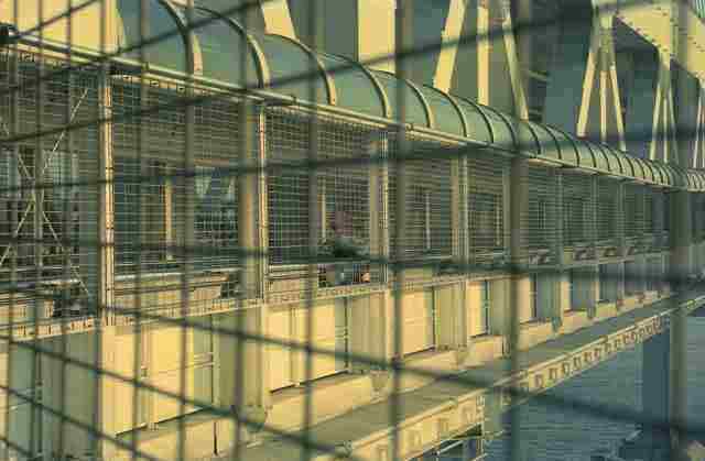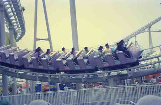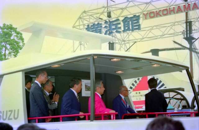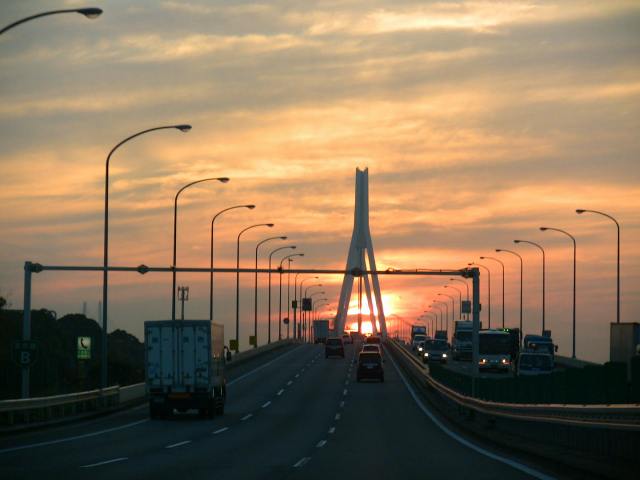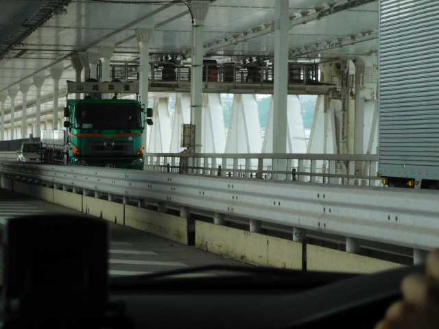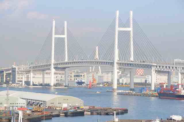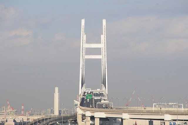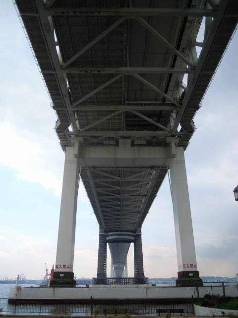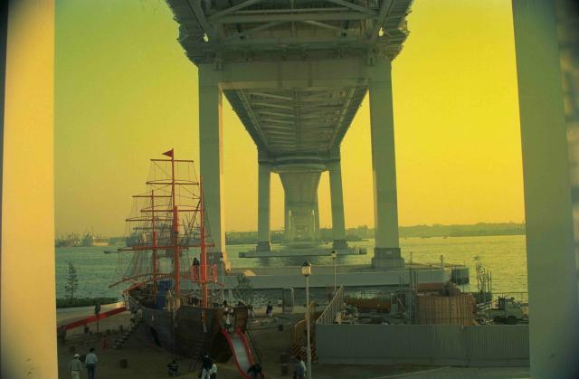 5.ベイブリッジの裏側 あの美しい吊り橋ですがその裏側は余り知られていません。実はこんなふうなんです。 ベイブリッジの開通直後にはその下の「大黒PA」付近にあの「日本丸」が展示されていました。また橋の一階部分にスカイウォークと呼ばれる歩道が併設されていました。大黒側から橋の中央部近くまで歩いて渡れ、みなとみらいや遠く丹沢山塊や富士山が見られましたが2010年限りで閉鎖になりました。そのスカイウオークにはスカイタワーから行くのです。※画面が黄色いのは当時のフィルムが変色したためです。 またこの橋は首都高速道路橋として有名ですがその高速道路は2階部分でその下の1階部分は国道357号線(一般道)として開放されています。現在では横浜港の北東側の大黒ふ頭と南側の本牧埠頭に二分された貨物ターミナルを結ぶためのトレーラーなどの大型が多く首都高の片側2車線に対して片側1車線で活躍しています。