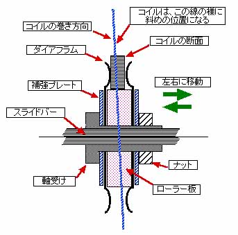 ローラーは、概略図にあるように、この接触子は、内側にある「ローラー板」をコイルの内側に接触しながら回転する。そして、両側のダイアフラムでコイルを挟み接触させる構造になっている。問題は、コイルの巻き線方向とローラーが回転しながら移動していくスライドバーと直角に交わっていないことだ。直角に交わると左右に移動しない意味する。回転方向に因り変化するけれど、このローラー接触子が、右方向に移動した時、左側のダイアフラムがコイルに接触しながらかいてんして移動する。故に移動方向の反対側に反る事になり、この反る事の繰り返しが疲労破壊の原因と断定できる。