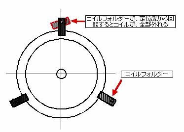 下図のようにコイルは3点で支持されている。そしてコイルのフォルダーは、両端共にで1か所でねじ止めされている。一か所でも、このコイルフォルダーを回転させて支持しなくなると残り2本とも外れる!!。再度、組み立てるのは、結構面倒になる